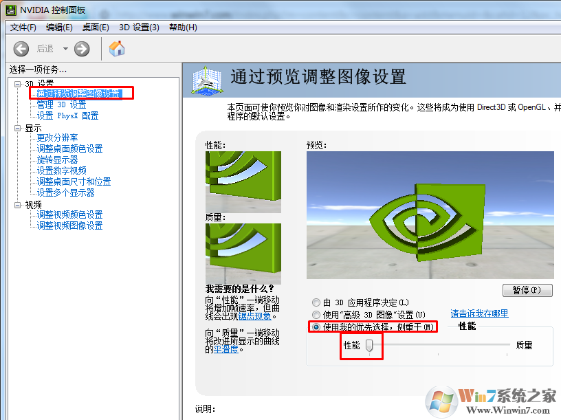 桌面上點擊右鍵選擇“NVIDIA控制面板”,進入設(shè)置里面開始操作修改:找到3D設(shè)置”---“通過預覽調(diào)整圖像設(shè)置”---“使用我的優(yōu)先選擇,側(cè)重于”---“性能”,最后點擊“應(yīng)用”保存設(shè)置。