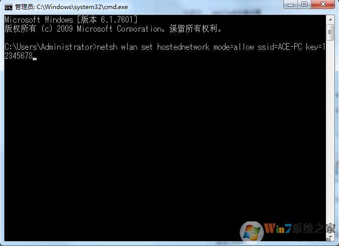 2、出現(xiàn)“命令提示符”輸入,在界面里輸入以下命令:netsh wlan set hostednetwork mode=allow ssid=ACE-PC key=12345678?;剀囘\行