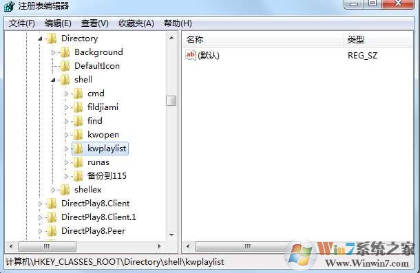 3、找到HKEY_CLASSES_ROOT\Directory\shell\ kwplaylist 刪除kwplaylist項;
