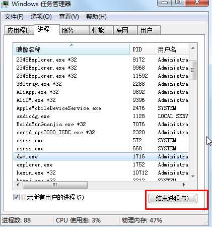 在進(jìn)程一欄中找到dwm.exe,單擊右鍵進(jìn)行接觸進(jìn)程,完成Win7系統(tǒng)dwm.exe的關(guān)閉,避免出現(xiàn)卡屏或是死機(jī)的情況。
