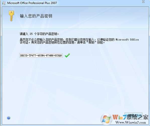 如上圖界面時輸入密鑰,下一步即即可激活Office2007免費使用。