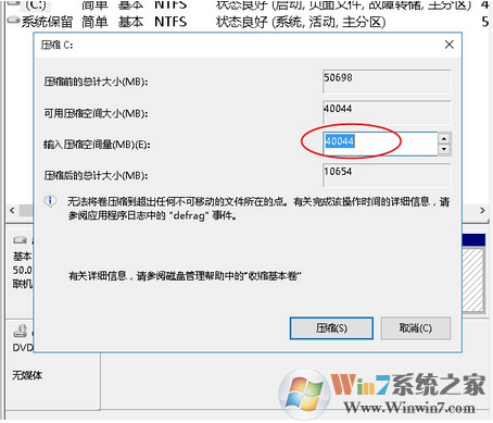 里面輸入的大小則是需要分出的空余空間(1G=1024M),最后選擇壓縮,之后根據(jù)提示一步步操作即可。