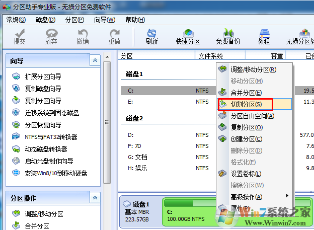 3、點(diǎn)擊你要分割的硬盤,右鍵找到切割分區(qū)