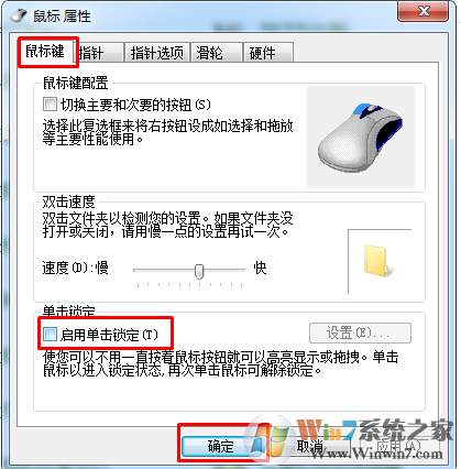 2、如果更換鼠標(biāo)后還是無效,那么我們就在控制面板中打開鼠標(biāo)屬性,選定“鼠標(biāo)鍵”標(biāo)簽頁(yè),其中有三欄,將最下面的“單擊鎖定”欄中的“啟用單擊鎖定”的勾去掉。