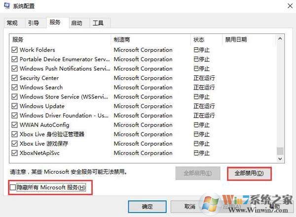 2、調(diào)出系統(tǒng)配置窗口后,點(diǎn)擊“服務(wù)”標(biāo)簽卡,勾選“隱藏所有microsoft服務(wù)”,然后點(diǎn)擊全部禁用(若您啟用了指紋識別功能,請不要關(guān)閉相關(guān)服務(wù)),如圖所示: