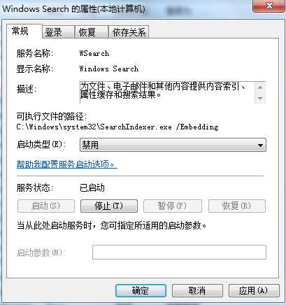 PS:禁止win7 Windows Search服務(wù)后將無法使用索引功能,搜索也會(huì)變慢,如果你需要使用搜索就不要禁用它。