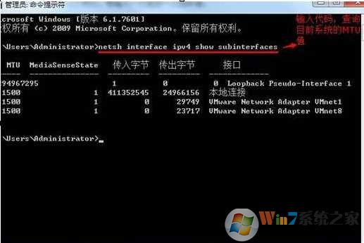 2.在打開的命令窗口中,輸入“netsh interface ipv4 show subinterfaces ”查詢到目前系統(tǒng)的MTU值。如下圖所示:
