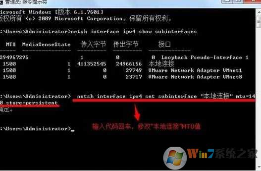 3.輸入“netsh interface ipv4 set subinterface "本地連接" mtu=1480 store=persistent”回車進行本地連接MTU值的修改。如下圖所示: