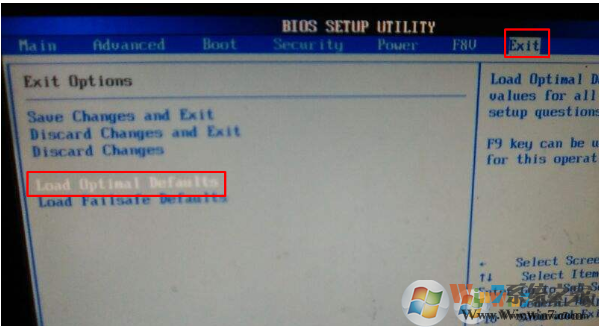 二、開機(jī)進(jìn)入bios,然后使用鍵盤方向鍵向右選擇到exit選項(xiàng),然后找到Load Optimized Default這個(gè)選項(xiàng)回車選擇Y即可