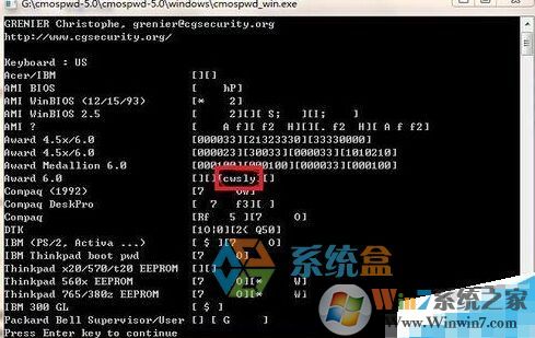 6、也可以使用Cmospwd軟件在命令提示符窗口查看BIOS密碼,它支持Acer、AMI、AWARD、COMPAQ、DELL、IBM、PACKARD BELL、PHOENIX、ZENITH AMI等多種BIOS,操作方法是:在DOS下啟動該程序,BIOS密碼就會顯示出來的。