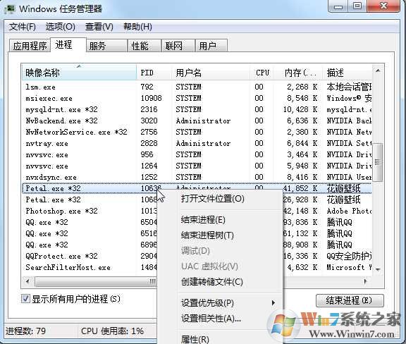 2、索性打開更換壁紙,然后打開進(jìn)程管理,找了一下進(jìn)程 從描述里找到了一個“花瓣壁紙”,如下圖;