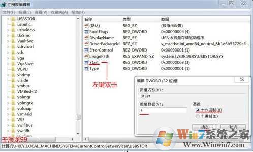 3、在UsbStor對應(yīng)的右側(cè)窗口找到:Start,左鍵雙擊:Start,在彈出的編輯DWORD(32 位)值窗口,把數(shù)值數(shù)據(jù)(V)欄中的值從“3”更改為“4”(基數(shù):十六進(jìn)制),再點(diǎn)擊:確定,退出注冊表編輯器;