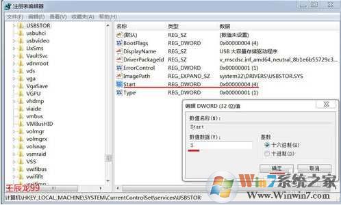 5、如果我們自己要使用USB,只要在注冊表編輯器中按照上述路徑,在UsbStor對應(yīng)的右側(cè)窗口找到:Start,左鍵雙擊:Start,在彈出的編輯DWORD(32 位)值窗口,把數(shù)值數(shù)據(jù)(V)欄中的值從“4”更改為“3”(基數(shù):十六進(jìn)制),再點(diǎn)擊:確定,退出注冊表編輯器;