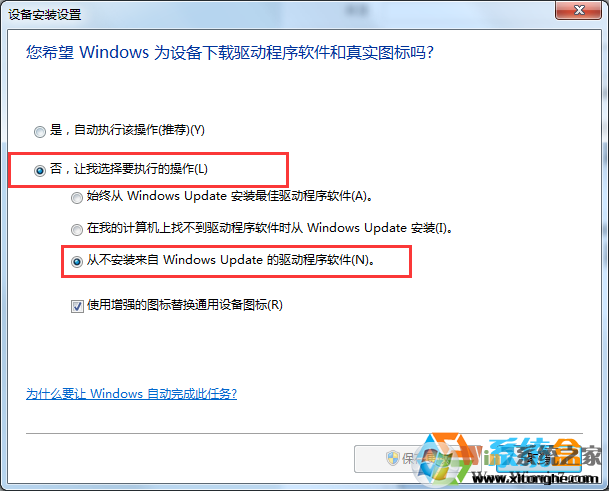 4、將“是,自動(dòng)執(zhí)行該操作”改為“否,讓我選擇要的操作”,然后選擇“從不安裝來自Windows updata的驅(qū)動(dòng)程序軟件”,再確定!