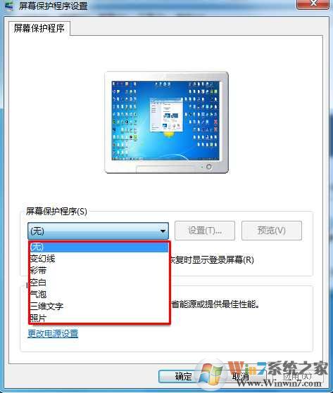 3、點(diǎn)擊后就出現(xiàn)win7屏幕保護(hù)程序的設(shè)置界面了,我們可以在下拉框中選擇一個(gè)要使用的屏幕保護(hù)程序;