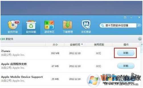 3、在卸載界面找到iTunes,然后點擊右側(cè)的“卸載”按鈕卸載此軟件。卸載完成后,打開iTunes軟件安裝包重新安裝軟件。