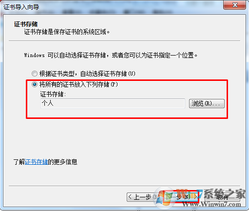 4、打開了“證書導(dǎo)入向?qū)?rdquo;窗口,點(diǎn)擊“下一步”,瀏覽到您備份的pfx密鑰證書,可能會無法找到,將瀏覽窗口下方的文件格式選擇為“個人信息交換(*.pfx;*.p12)”,然后再去找。打開