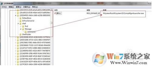 4、同樣方法開發(fā)注冊(cè)表編輯器,定位到HKEY_LOCAL_MACHINE\SOFTWARE\Classes\CLSID\{20D04FE0-3AEA-1069-A2D8-08002B30309D}\shell\Manage\command,將右窗格中的“默認(rèn)”鍵值(雙擊打開)修改為mmc.exe %windir%\system32\compmgmt.msc 。關(guān)閉注冊(cè)表編輯器,此時(shí)“管理”應(yīng)該可以打開了,此方法可以修復(fù)由于CompMgmtLauncher.exe 調(diào)用失效所引起的“管理”打不開,此時(shí)系統(tǒng)將直接調(diào)用compmgmt.msc而不是CompMgmtLauncher.exe