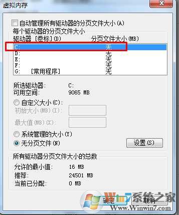 第四步:先選中C盤,鈀C盤設(shè)置為無(wú)分頁(yè)文件,然后把所有的分區(qū)都設(shè)置為無(wú)分頁(yè)文件;