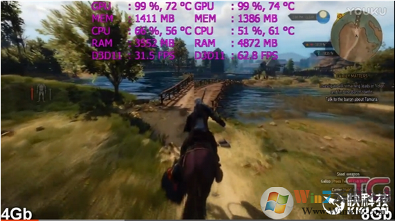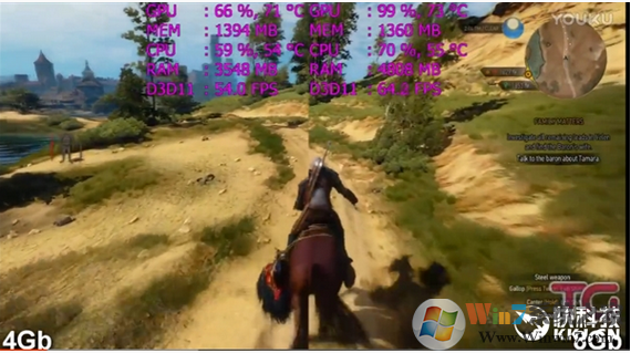 如果仔細觀察可以發(fā)現(xiàn),大部分場景下,4GB電腦的幀數(shù)要比8GB少8~10幀左右,但是4GB非常不穩(wěn),從筆者的截圖可以看出,在《巫師3》《戰(zhàn)地1》《孤島危機3》《GTA5》中,部分場景的瞬時差異也以達到幾十倍,反映在游戲體驗上就是4GB電腦的卡頓、不流暢。