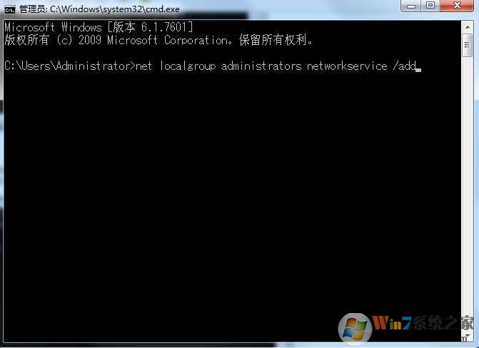 ③繼續(xù)在命令提示符窗口輸入(按回車執(zhí)行):net localgroup administrators networkservice /add