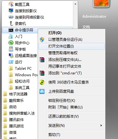 3、在“開(kāi)始->所有程序”中找到“附件”。右鍵單擊“命令提示符”,選擇“以管理員身份運(yùn)行”;