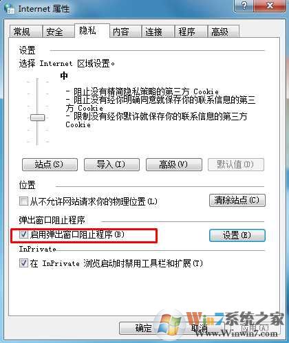 4、在隱私選項卡下,勾選啟用彈出窗口阻止程序 選項,設置后保存;
