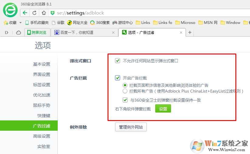 開啟廣告屏蔽,以360安全瀏覽器為例,在設置中“廣告過濾”選項下,勾選廣告攔截的項目就可以了。