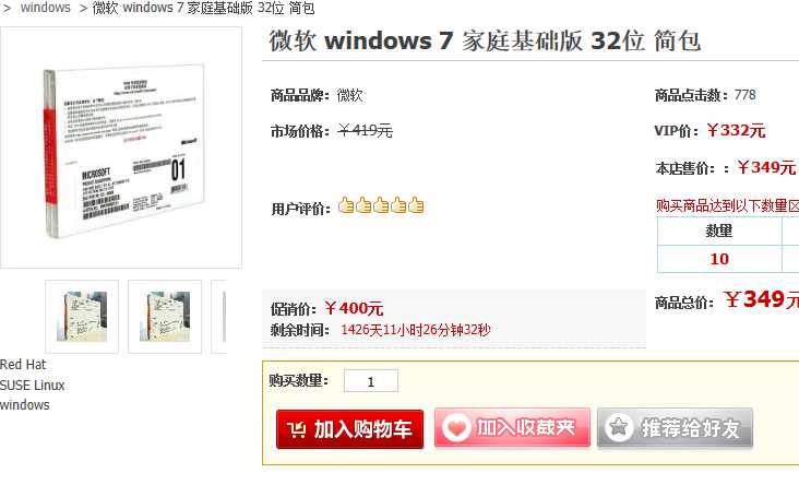 微軟 windows 7 家庭基礎(chǔ)版 64位 簡包價格為 400人民幣左右 32位的價格則要更低一些,在330元左右。