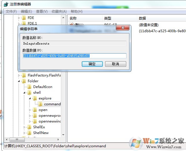 3.確定DelegateExecute數(shù)值數(shù)據(jù)欄中的內(nèi)容是否為{11dbb47c-a525-400b-9e80-a54615a090c0}。如果不是,請(qǐng)輸入 替換內(nèi)容{11dbb47c-a525-400b-9e80-a54615a090c0} ,再“確定”保存