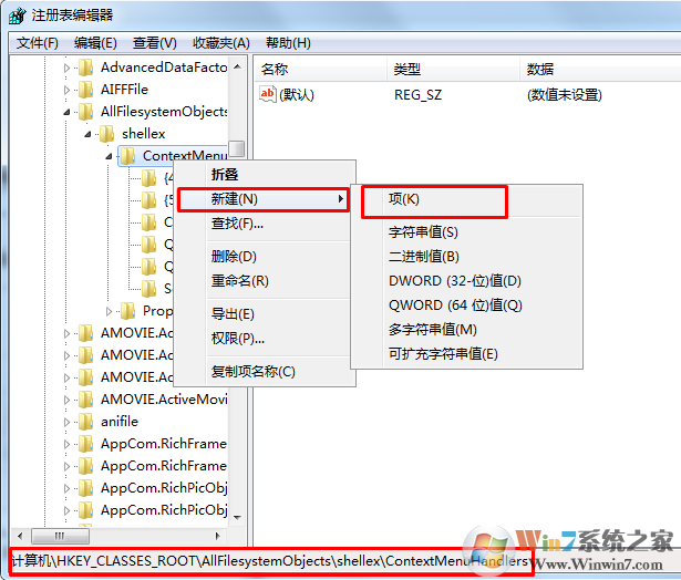 2、在注冊表編輯器中,依次打開HKEY_CLASSES_ROOT\AllFilesystemObjects\shellex\ContextMenuHandlers\,然后在該鍵值上點擊鼠標右鍵,選擇“新建→項”(如下圖),并將項值命名為“{C2FBB630-2971-11D1-A18C-00C04FD75D13}”(不包含雙引號),這是在鼠標右鍵菜單里添加“復制到文件夾”菜單。