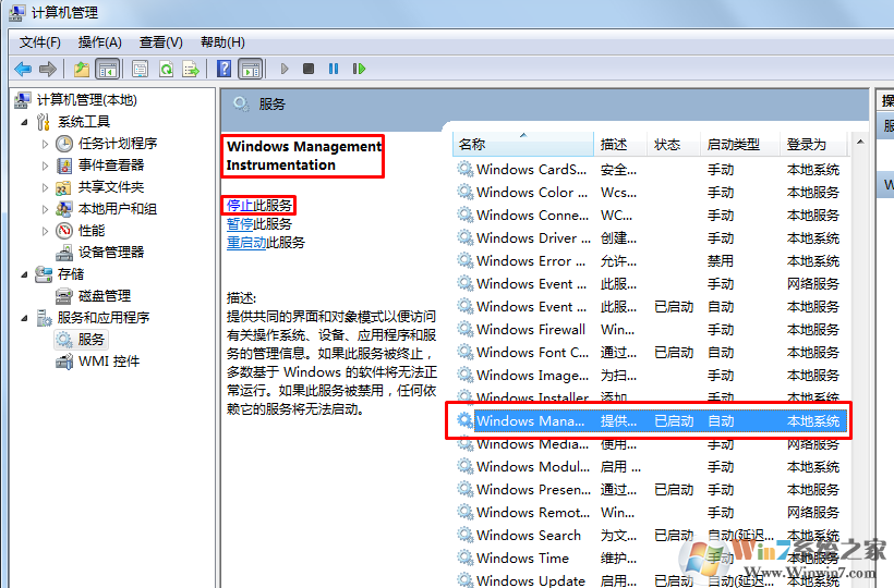 1、右擊“我的電腦”-“管理”,在“服務(wù)和應(yīng)用程序”下單擊“服務(wù)”,停止Windows Management Instrumentation 服務(wù)