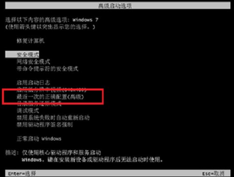 1、啟動電腦后,不停點擊按 F8 鍵,出現(xiàn)菜單啟動選項,選擇"最后一次的正確配置"選項,看可否正常進入系統(tǒng),如圖: