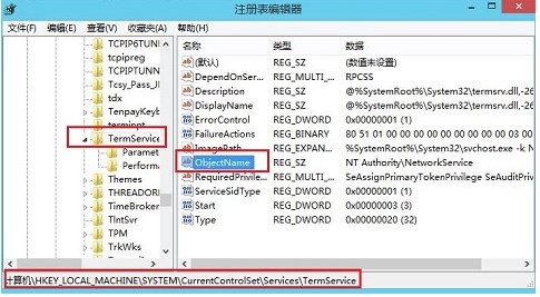 (1)在安全模式下點擊開始-運行-輸入"regedit"命令打開注冊表,進入 KHEY_LOCAL_MACHINESYSTEMCurrentControlSetservicesTermService 下面將 Name 改為:LocalSystem;,如圖: