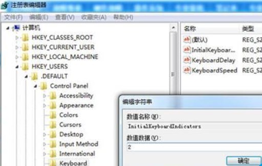 2、接著運行regedit打開注冊表編輯器,定位到HKEY_USERS.DEFAULTControl PanelKeyboard,將它下面的InitialKeyboardIndicators的鍵值改為“2”,之后點擊確定退出注冊表編輯器,然后重啟即可。