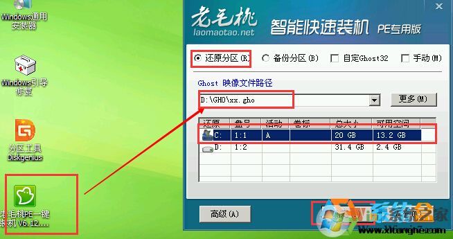 5、分區(qū)完成后,我們就可以使用U盤(pán)啟動(dòng)盤(pán)PE工具里的一鍵裝機(jī)工具或Ghost安裝器進(jìn)行系統(tǒng)恢復(fù)了,如下圖XX.GHO為舊磁盤(pán)系統(tǒng)備份。