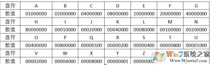 接下來,我們需要針對想隱藏的硬盤分區(qū),修改“00,00,00,00”對應(yīng)的字符位置。比如,要隱藏C盤就改為“04,00,00,00”,隱藏D盤就改為(08,00,00,00)。關(guān)于盤符對應(yīng)的二進(jìn)制編碼請見下圖。