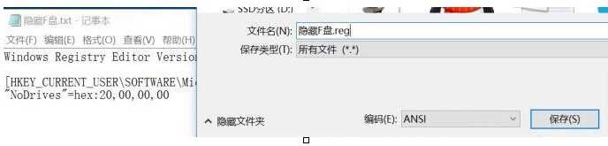 比如小編這次想隱藏F盤,只要將二進(jìn)制編碼改為“20,00,00,00”,然后將這個(gè)文本文檔另存為“隱藏F盤.reg”,文件類型記得選“所有文件”。