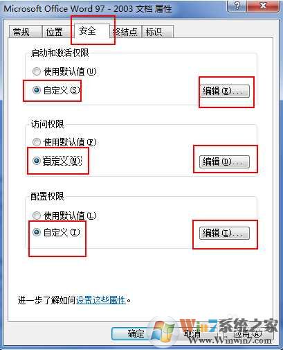 9、然后點擊“安全”,將下方三個權(quán)限都勾選“自定義”,并且分別點擊“編輯”按鈕,添加everyone權(quán)限。
