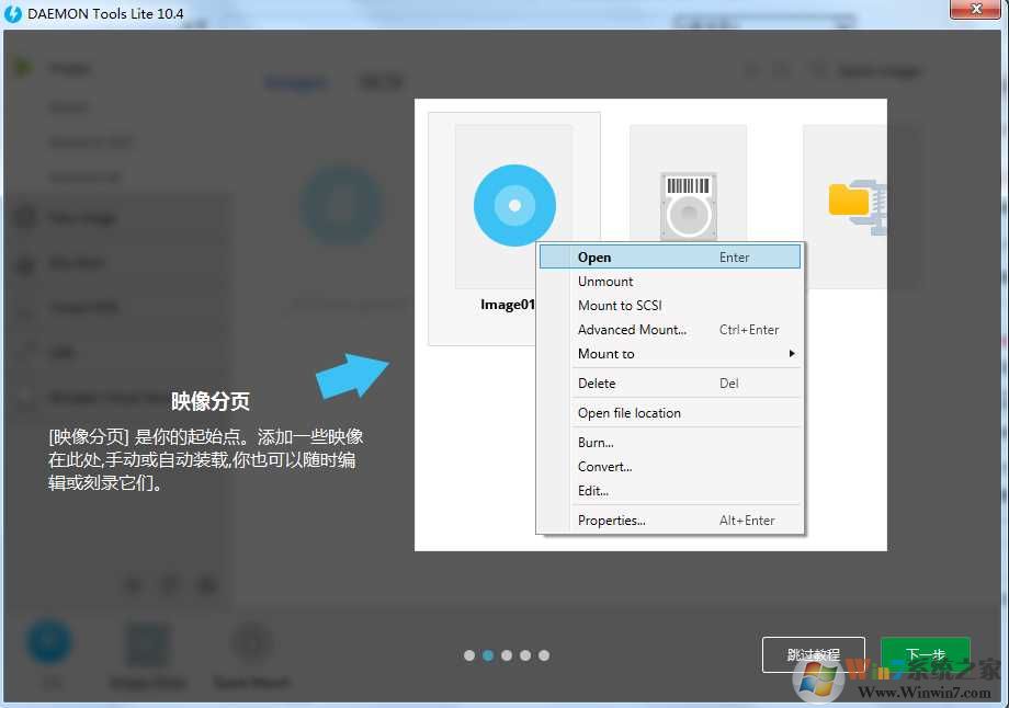 1、打開(kāi)daemon tools lite,初次打開(kāi)會(huì)出現(xiàn)教程,很是方便,不過(guò)太啰嗦,小編直接跳過(guò);winwin7.com