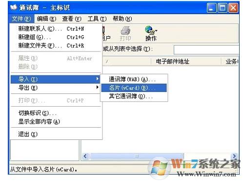 2、單擊菜單欄的“文件”,彈出的菜單指向“導(dǎo)入”,在下一級(jí)菜單單擊“名片”