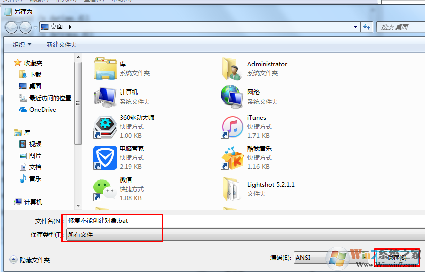 3、另存為,并重命名文本文檔,如:修復(fù)不能創(chuàng)建對(duì)象.bat。并保存到桌面方便查找