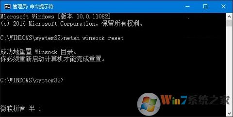 2、輸入命令netsh winsock reset并點(diǎn)擊回車。