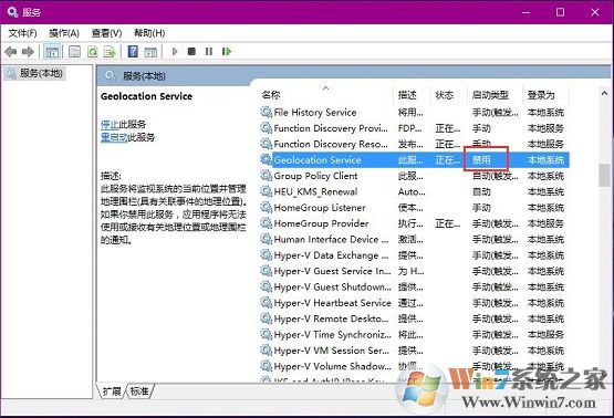 2、在服務(wù)中找到名為Geolocation Service的服務(wù),雙擊打開其屬性。
