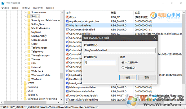 3、在右側找到BingSearchEnabled,雙擊后,將其數(shù)值數(shù)據(jù)改為1
