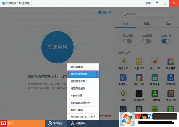 4、重啟文件資源管理器,可用軟媒魔方首頁的“快捷指令”完成。