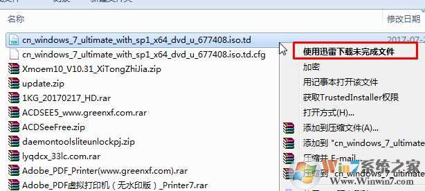 右鍵點(diǎn)擊使用迅雷繼續(xù)下載未完成的文件即可,如下圖: