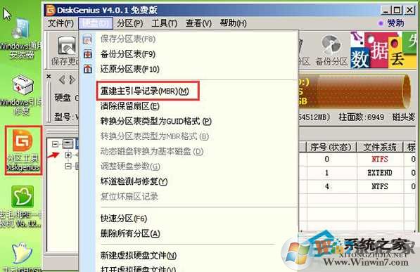 2、然后在菜單上點(diǎn)擊“硬盤”——“重建主引導(dǎo)記錄(MBR)”選項(xiàng),出現(xiàn)確定后點(diǎn)“是”;