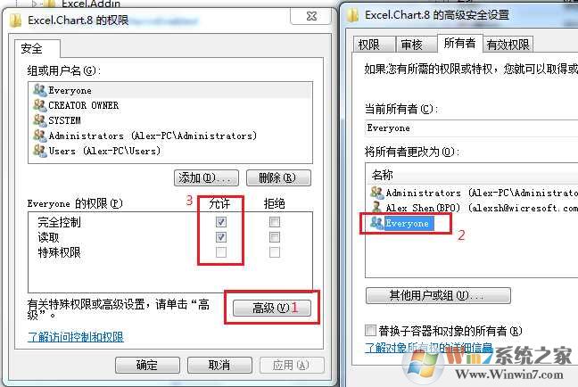 3.點擊“高級”-“所有者”,選中“Everyone”,并勾選“替換子容器和對象的所有者”,然后點擊應(yīng)用,并將Everyone的權(quán)限未完全控制: