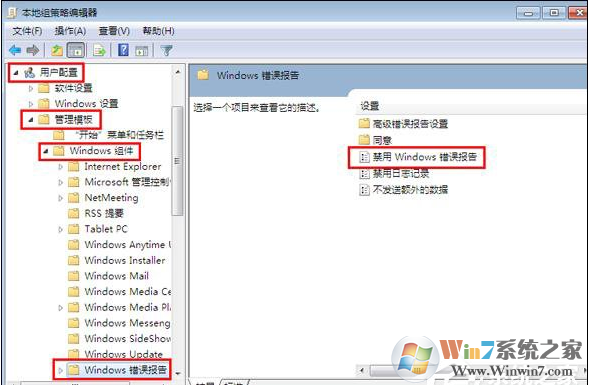 2、在組策略中依次打開(kāi)用戶配置→管理模版→windows組件→windows錯(cuò)誤報(bào)告,在右側(cè)找到“禁用windows錯(cuò)誤報(bào)告”,如圖所示: